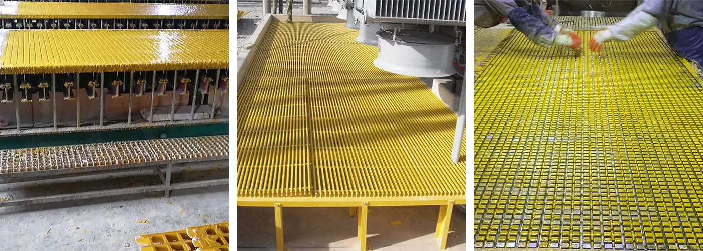 There are three main types of FRP grating production processes: reciprocating fiber winding process, continuous fiber winding process and centrifugal casting process.